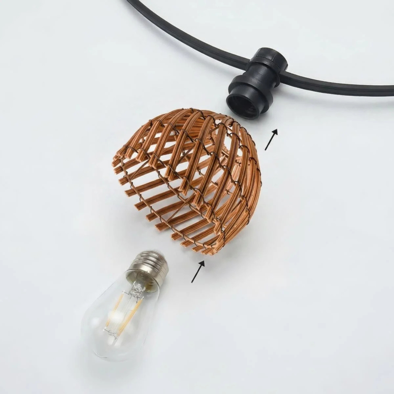 De ronde gevlochten lampenkapjes in donkere houtkleur geven de verlichting een natuurlijke en warme uitstraling die perfect past bij moderne tuinen, bohemian stijlen, strandtenten en horeca terrassen.
