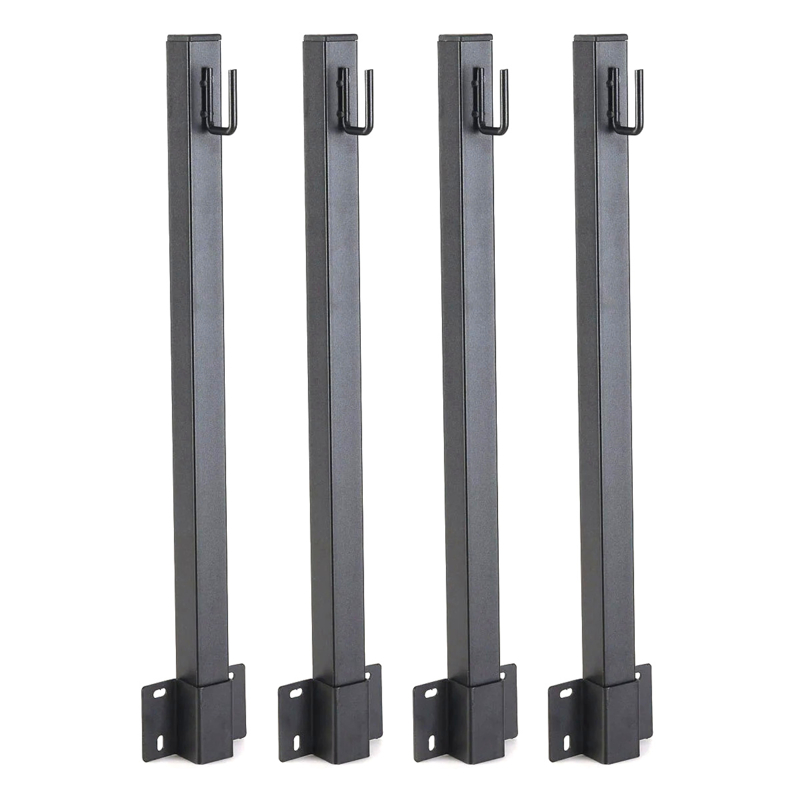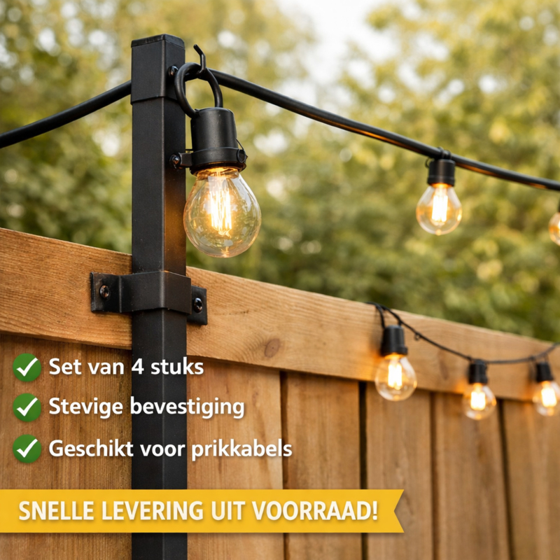 Deze set bestaat uit 4 vierkante metalen paaltjes die speciaal zijn ontworpen voor het bevestigen van lichtsnoeren. Met de meegeleverde beugels monteer je de paaltjes eenvoudig aan je schutting of dakrand. De haak aan de bovenzijde zorgt ervoor dat je de kabel snel en stabiel kunt ophangen.